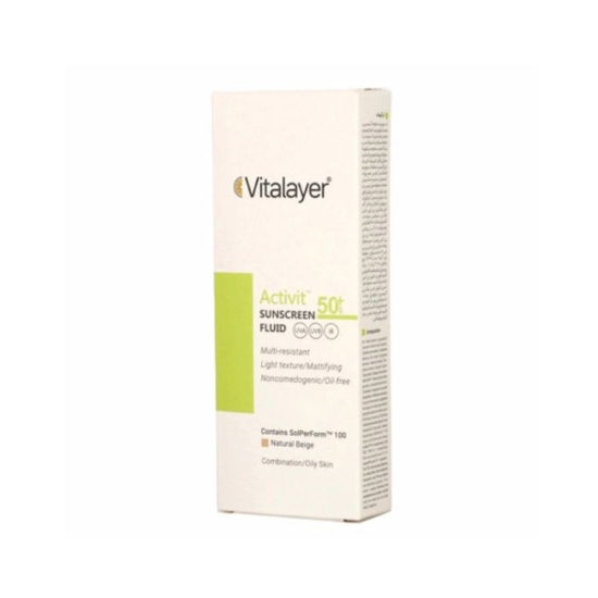 فلوئید ضد آفتاب رنگی Activit ویتالیر با SPF50، محصولی تخصصی برای محافظت از پوست چرب و مستعد آکنه در برابر اشعه‌های مضر UVA و UVB است. این ضد آفتاب بافتی بسیار سبک، غیرچرب و سریع‌الجذب دارد که به‌خوبی روی پوست پخش می‌شود و با رنگ بژ طبیعی خود، ظاهری یکنواخت و مات به پوست می‌بخشد.